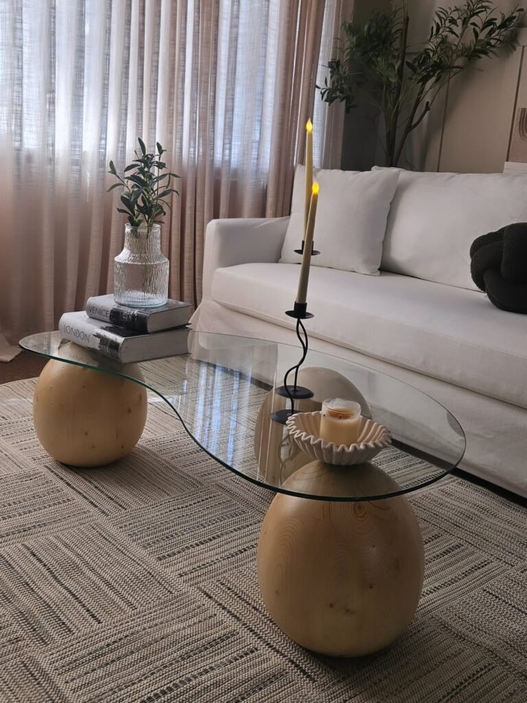 This coffee table is like a piece of modern art that happens to be functional! Those two rounded wood bases look like they’re having a conversation under that sleek glass top.