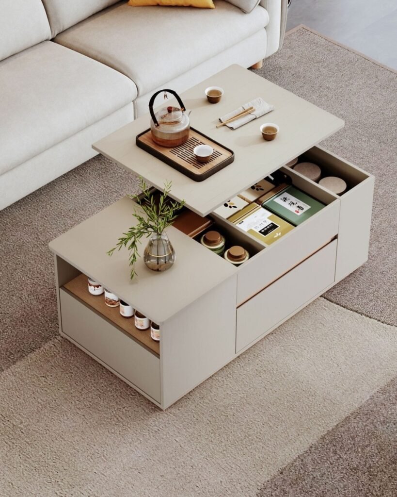 This is seriously genius – a coffee table that actually works as hard as you do! Look at all that hidden storage tucked away so cleverly. They’ve set up the most zen tea ceremony moment on top with that gorgeous ceramic teapot and matching cups on a wooden tray.