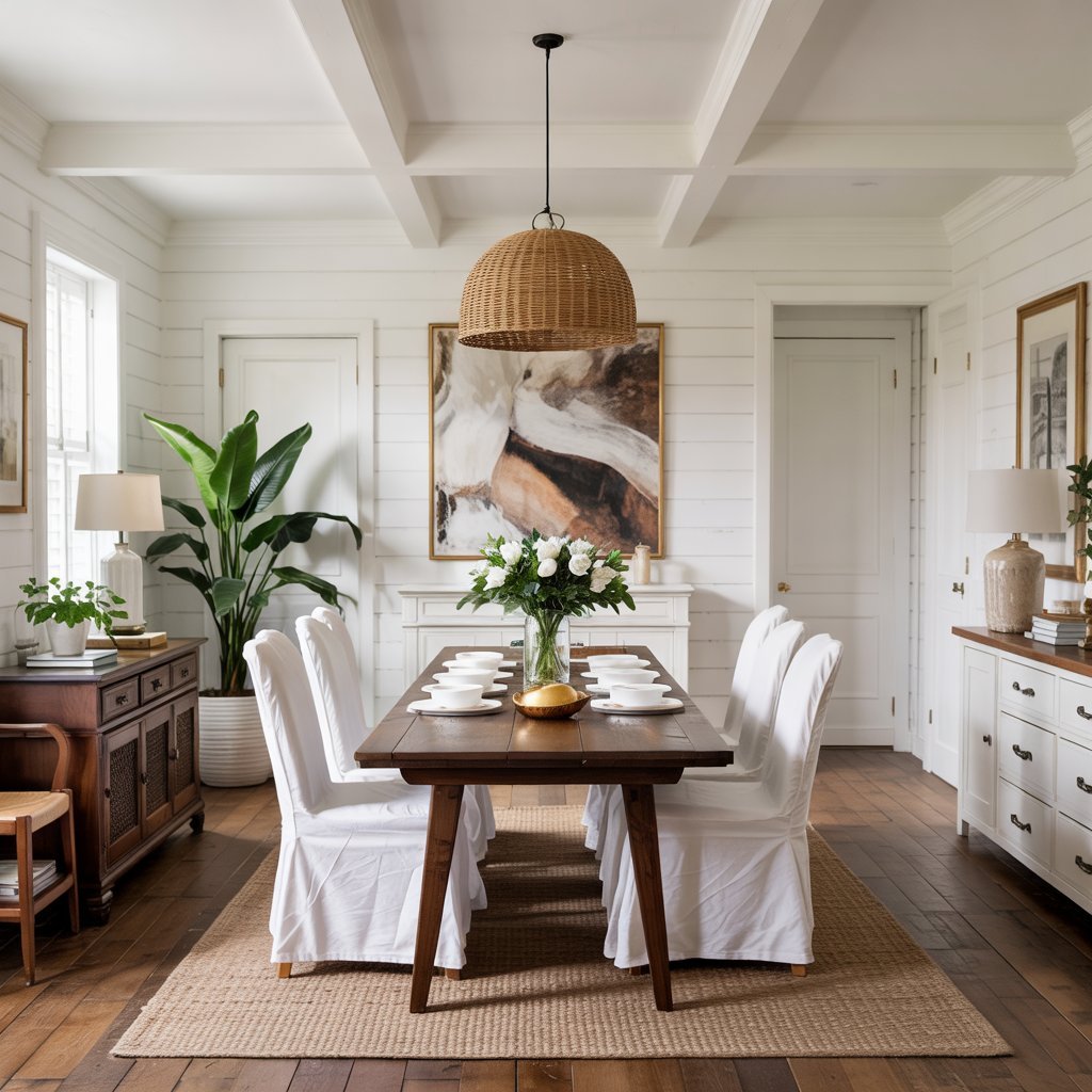 Think chocolate brown furniture against bright white shiplap walls, or a dark wood dining table surrounded by white chairs. The contrast increases the drama while keeping things elegant.
