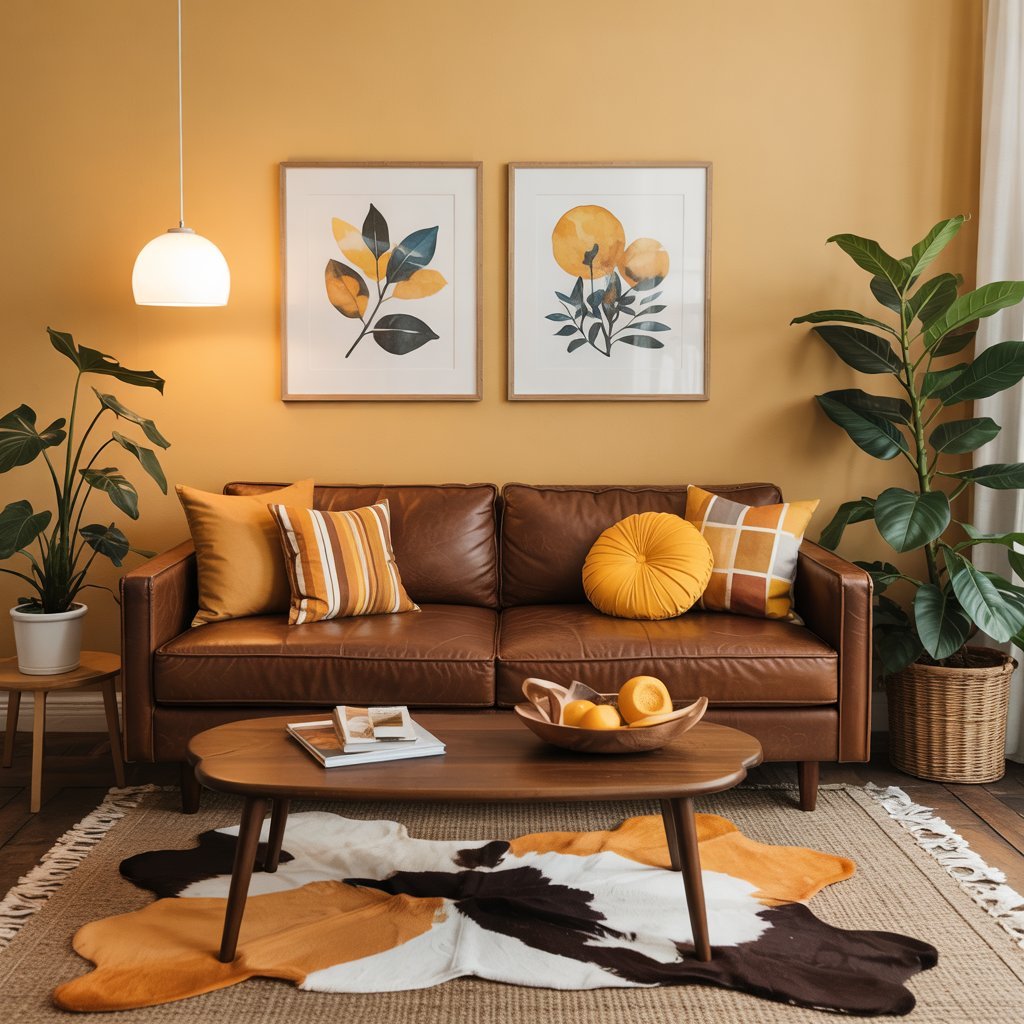 Picture a brown leather sofa with bright yellow accent pillows, or honey-toned wood furniture against walls with yellow undertones. This pairing feels retro and fun.