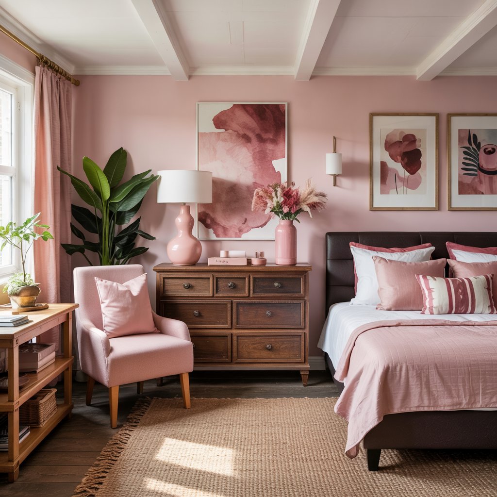 Lighten up dark brown furniture or flooring with soft pink accents to create a balanced and inviting space. The warmth in both colors allows them to blend seamlessly, especially when paired with crisp white walls.