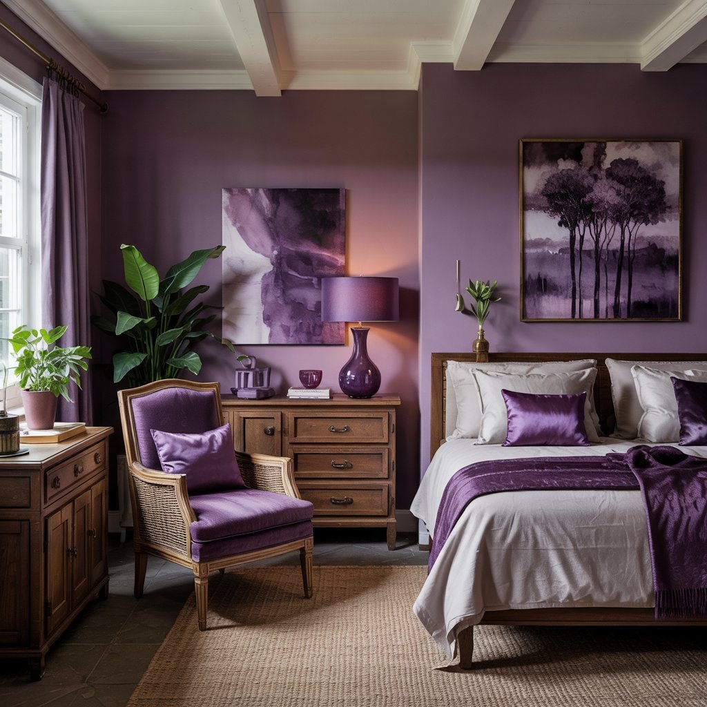 For a dramatic and sophisticated look, pair dark wood cabinetry or furniture with rich plum or deep purple walls. Opt for purples with gray or brown undertones to ensure a harmonious blend.