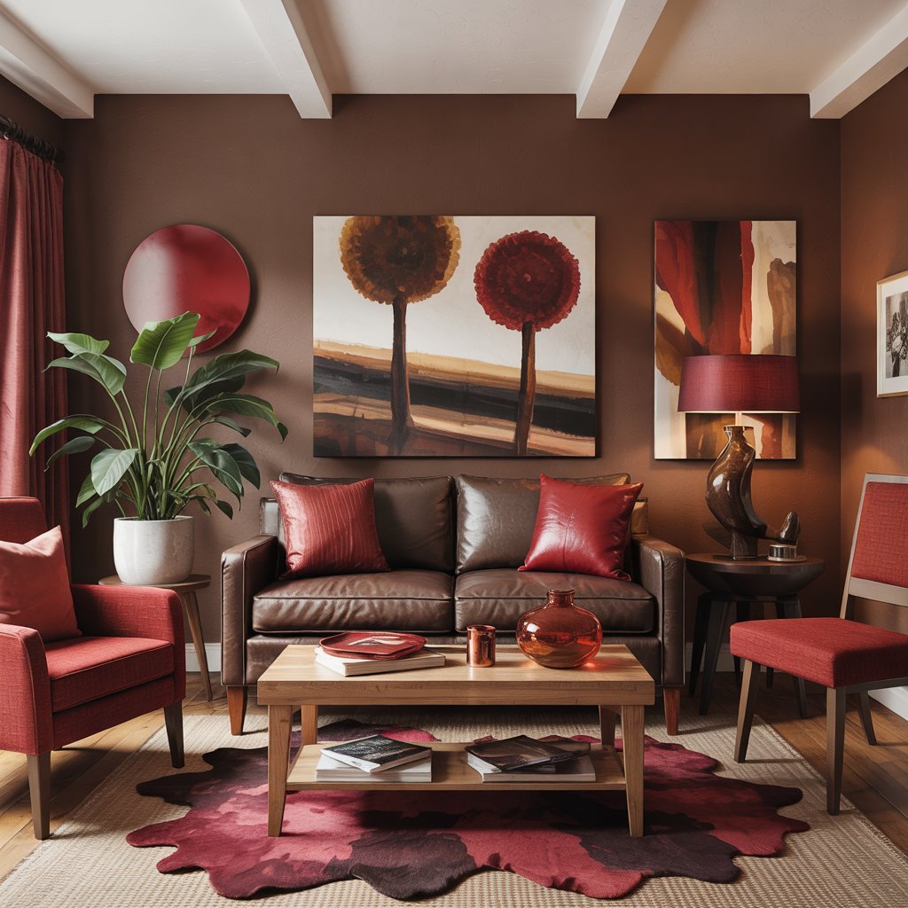 Burgundy or crimson accents work beautifully against brown walls or furnishings, adding depth and elegance.