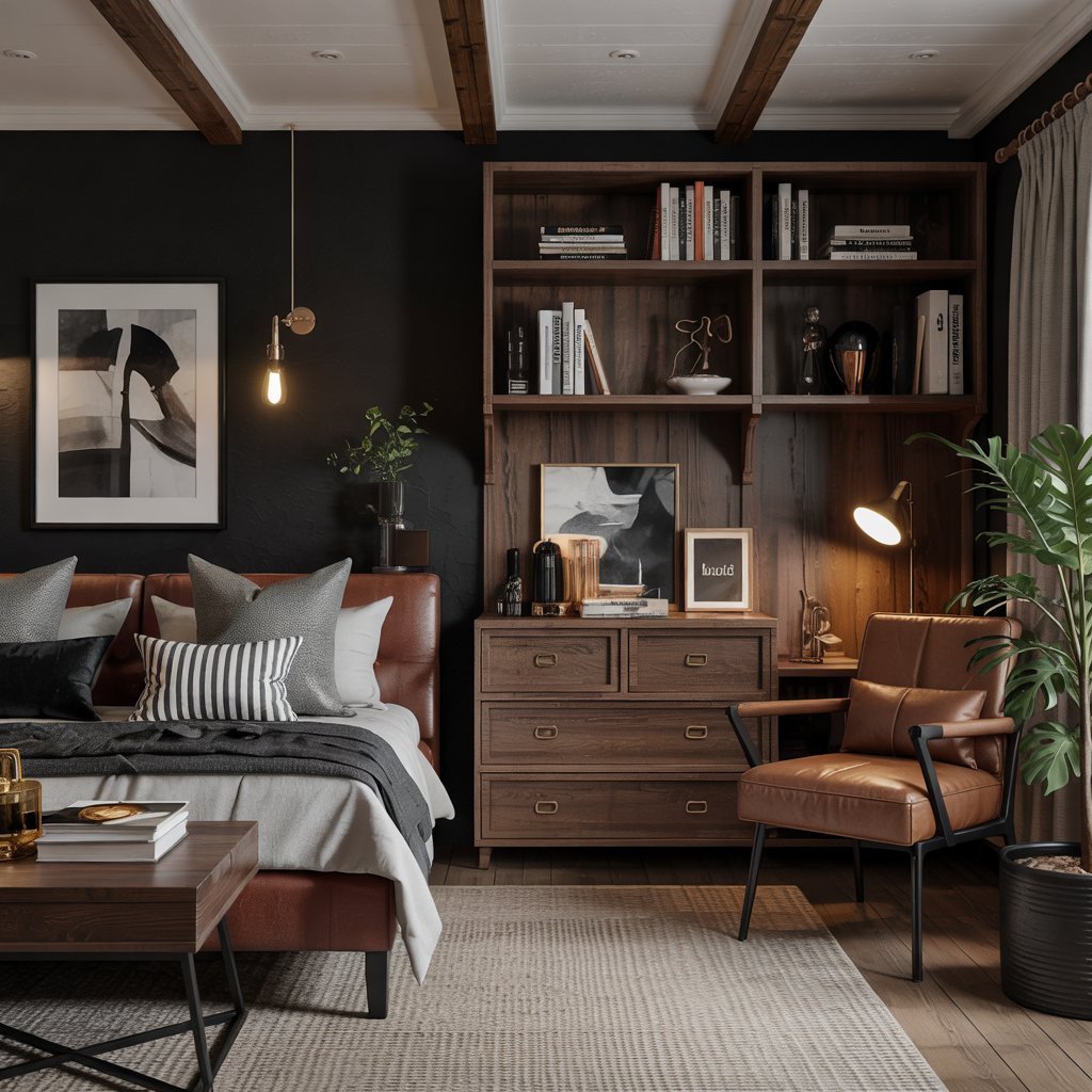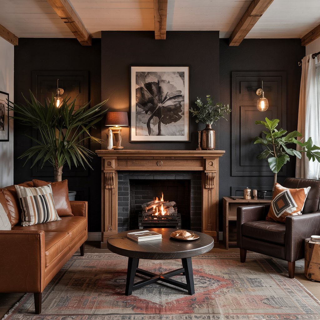 The key is to play with textures and finishes—think matte black against glossy brown wood or black metal fixtures paired with rich wood furniture.