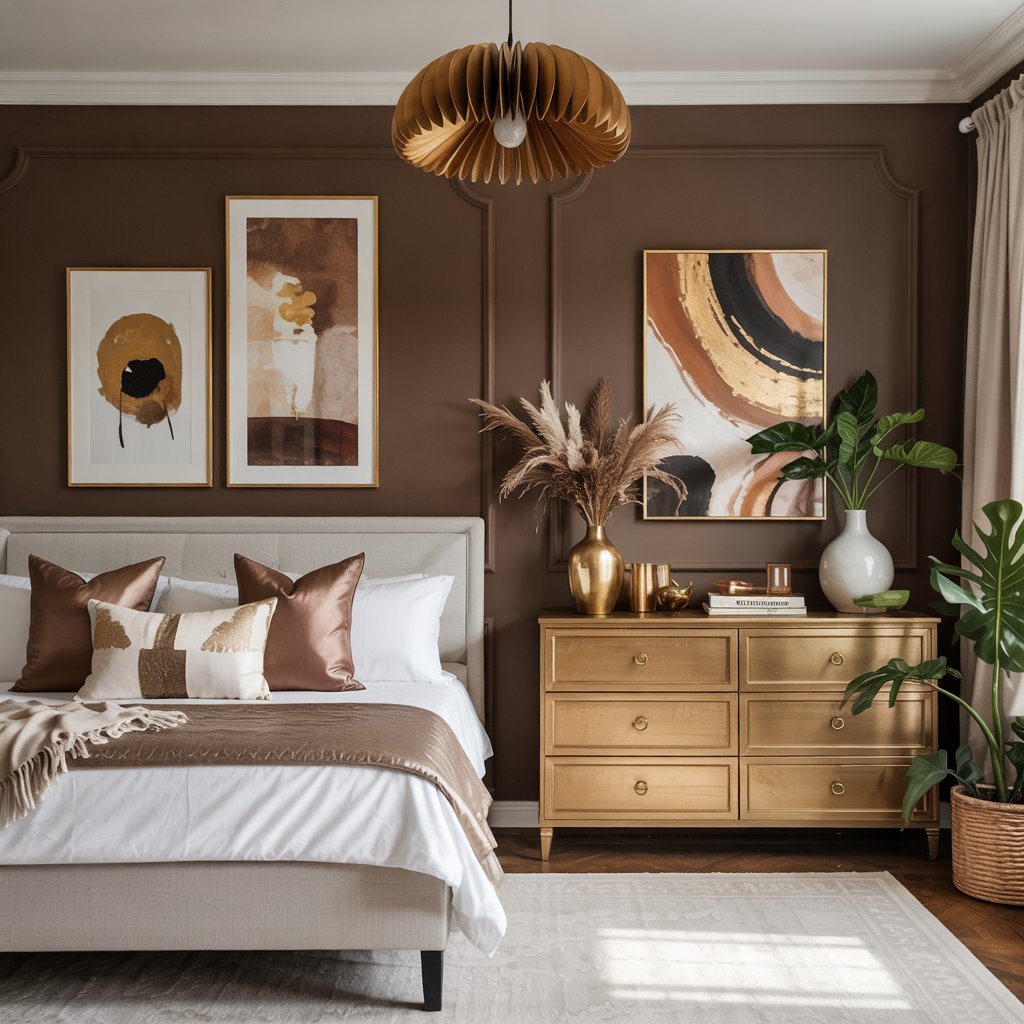 Gold metallics bring a touch of glamour and sophistication to brown spaces. Whether through brass hardware, gold picture frames, or metallic accents in lighting or artwork, this pairing feels luxurious and intentional.