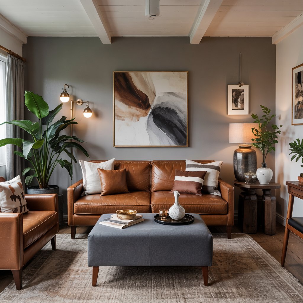 For a modern rustic aesthetic, combine brown with deep charcoal hues. Charcoal’s cool, dark tones provide a striking contrast to the warmth of brown leather, wood mantels, or coffee tables.