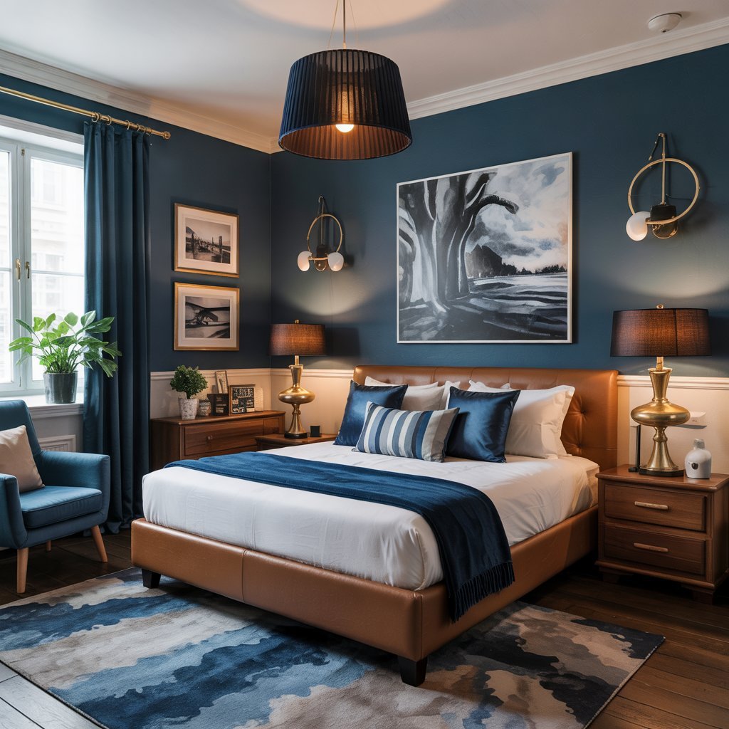 Taking blue deeper into navy territory creates even more sophistication. Navy brings richness and depth that complements brown beautifully, making this combination ideal for formal spaces or contemporary designs.