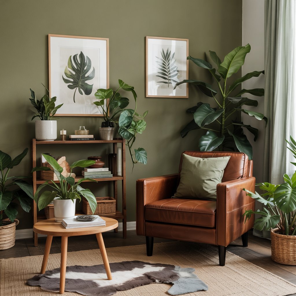 Consider brown leather chairs with olive green throw pillows, or pair dark wood floors with sage green walls. Add plenty of houseplants to reinforce the natural vibe.
