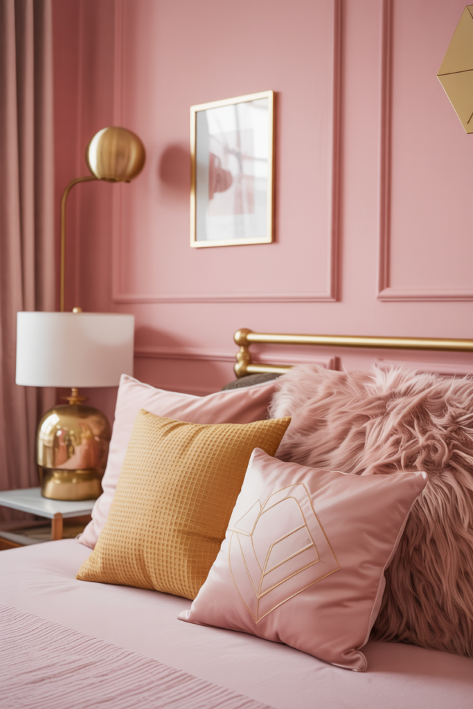 Throw pillows, lamps, or picture frames in gold are easy ways to bring this combo to life. It works with both soft blush tones and brighter pinks, giving a rich, elegant touch.