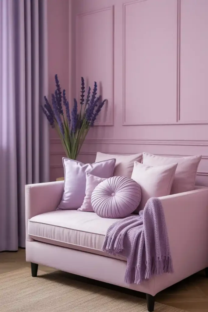 I like using lavender as accents like pillows or curtains alongside pink walls or furniture. It adds a subtle contrast that keeps the space fresh and not too sweet.