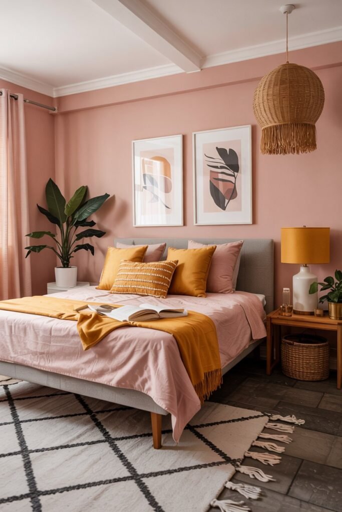 When I use mustard yellow in my space, it often comes in accents like cushions, lamps, or rugs. It has this cool way of making pink pop without overwhelming the room.