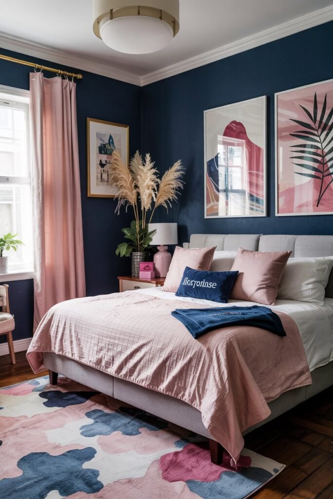 In my experience, navy blue can ground a space without making it feel heavy. I’ve found that adding pink accents, like pillows or art, brings warmth and a playful touch to the room.