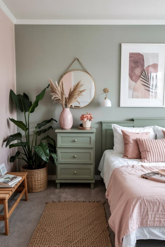 In my experience, using sage green on walls or furniture with pink accents like pillows or throws can make a space look inviting without being too bold. Adding natural textures like wood or linen helps balance the look even more.