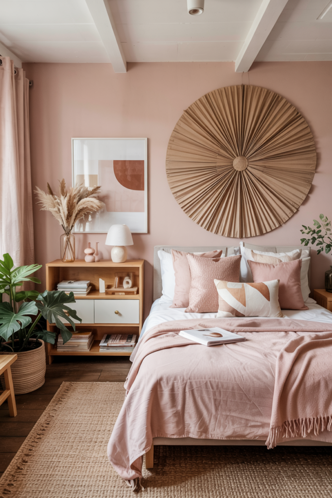 Using metallic accents like gold or brass with pink warms up the space instantly. I also like mixing textures—velvet pillows, woven baskets, and smooth ceramics—to make the colors stand out more and feel inviting.