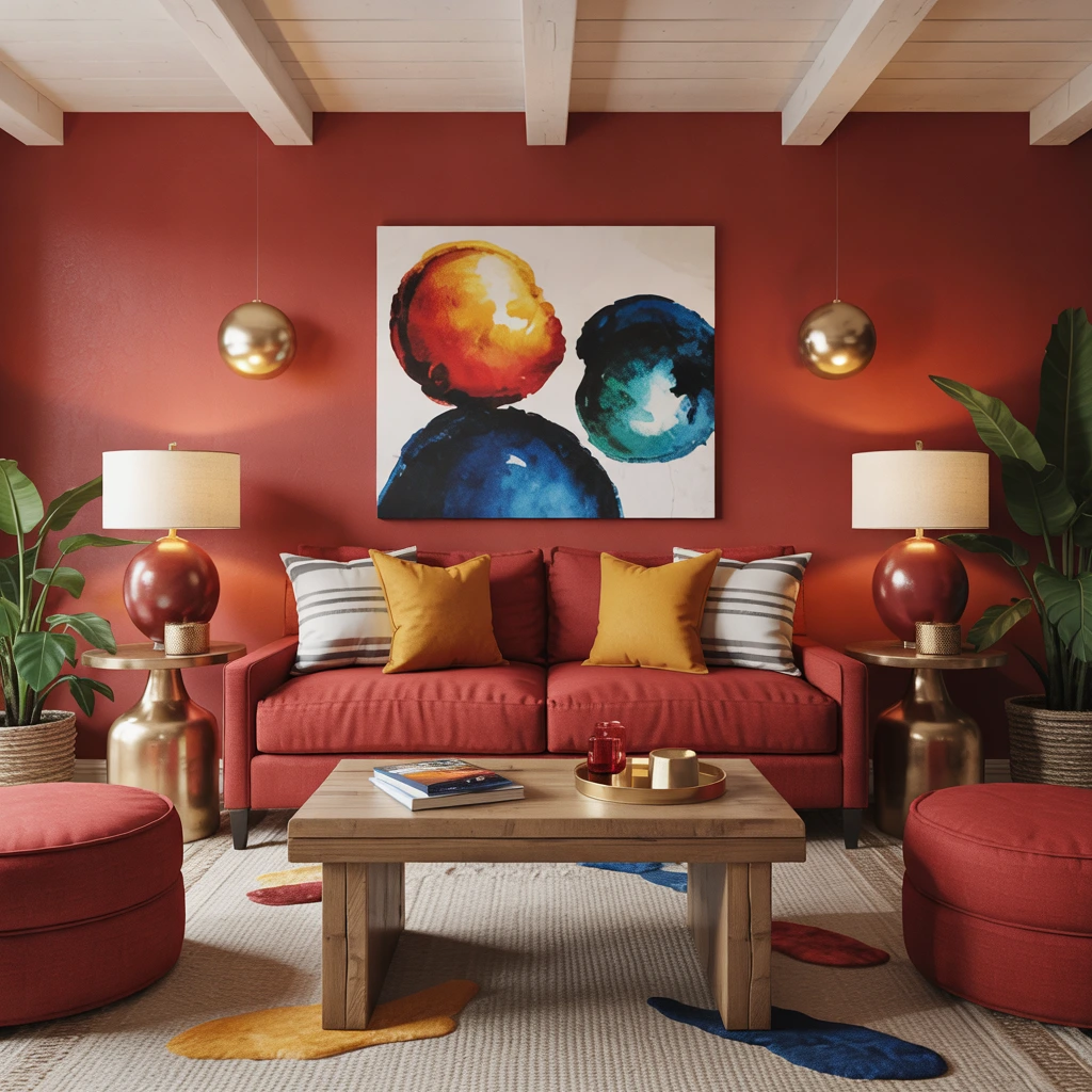 I balance red ottomans, side tables, and accent pillows with blue walls and pops of golden yellow in throw pillows. All three colors work together because they share similar jewel-tone values. The result feels vibrant yet balanced.