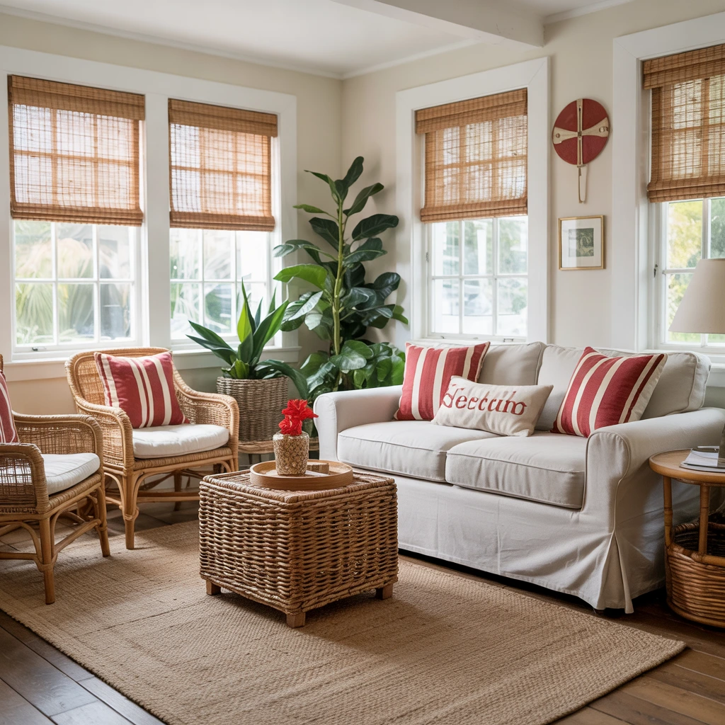Red-striped pillows against slipcovers and woven furnishings like rattan chairs create a soothing atmosphere. The neutral backdrop allows red to pop without overwhelming the space. Matchstick blinds add another layer of natural texture.