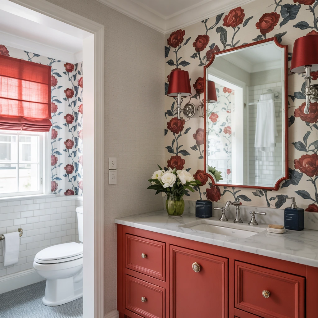 Floral wallpaper featuring red and navy provides a modern twist in bathrooms when paired with marble-topped vanities. Wall sconces in vibrant red repeat the cabinetry color, while navy sink accessories tie the whole look together.