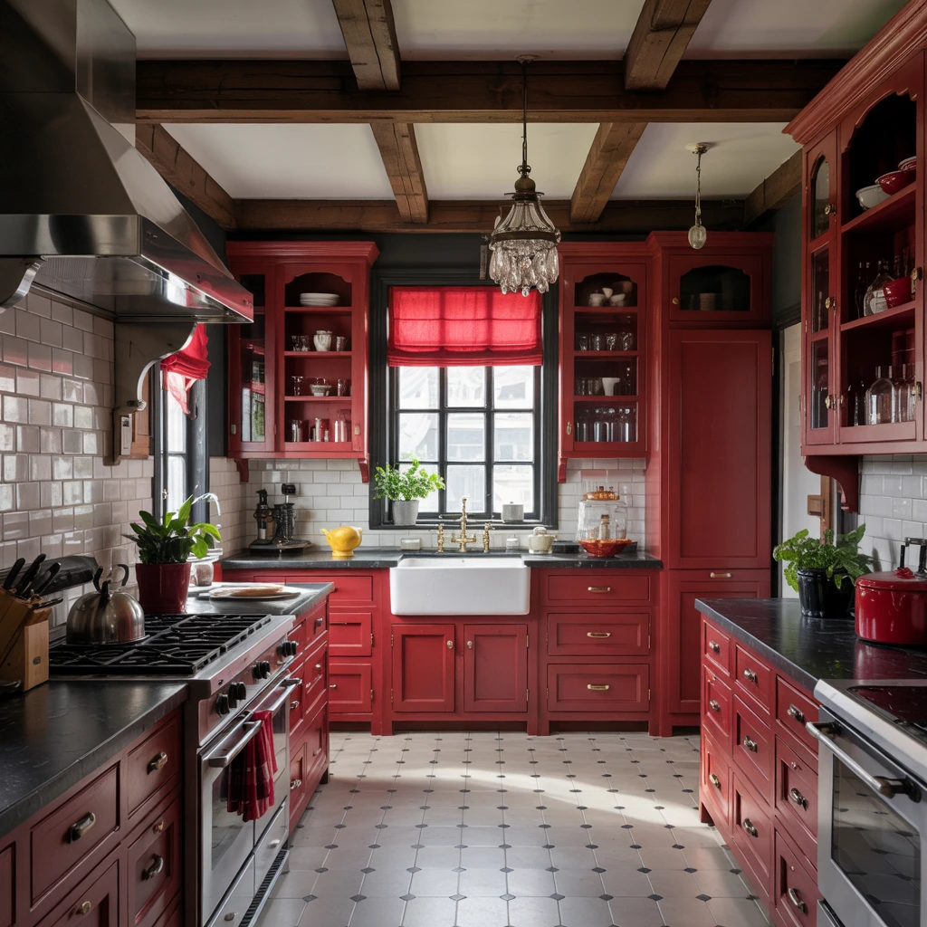 Red-painted cabinetry with black-and-white tile flooring embodies classic character. Crystal cabinet hardware enhances the old-fashioned charm. For balance, I often add a third accent color like yellow to prevent the scheme from feeling too intense.