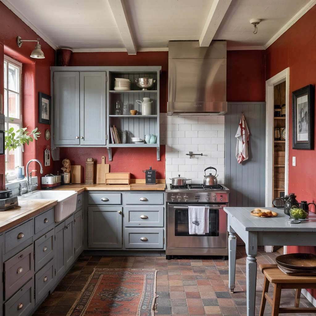 Stormy gray adds depth and modernity to red color schemes. I find this combination particularly effective in kitchens.