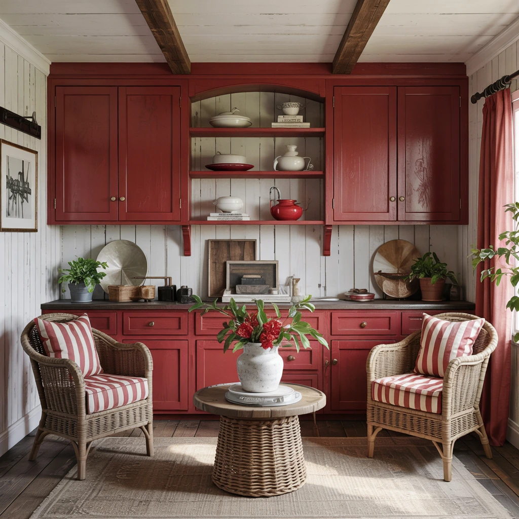 Varying the intensity of red—like using bright red lower cabinets and dark maroon upper cabinets—adds character to built-in buffets. Weathered white walls prevent the multiple red shades from overwhelming the space. Red and white striped accents on rattan furniture enhance the vintage aesthetic.