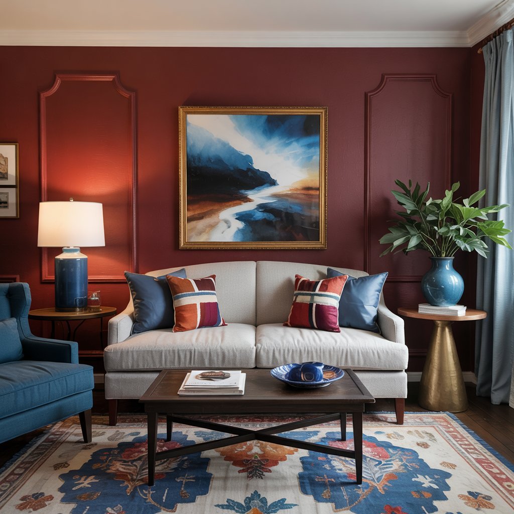 I pair oxblood red (a deep burgundy) with bright cerulean blue accents and a white sofa as a neutral focal point. The white brightens the scheme and prevents the rich, saturated colors from feeling too heavy. Research shows that thoughtfully designed color schemes can improve mood and reduce stress.