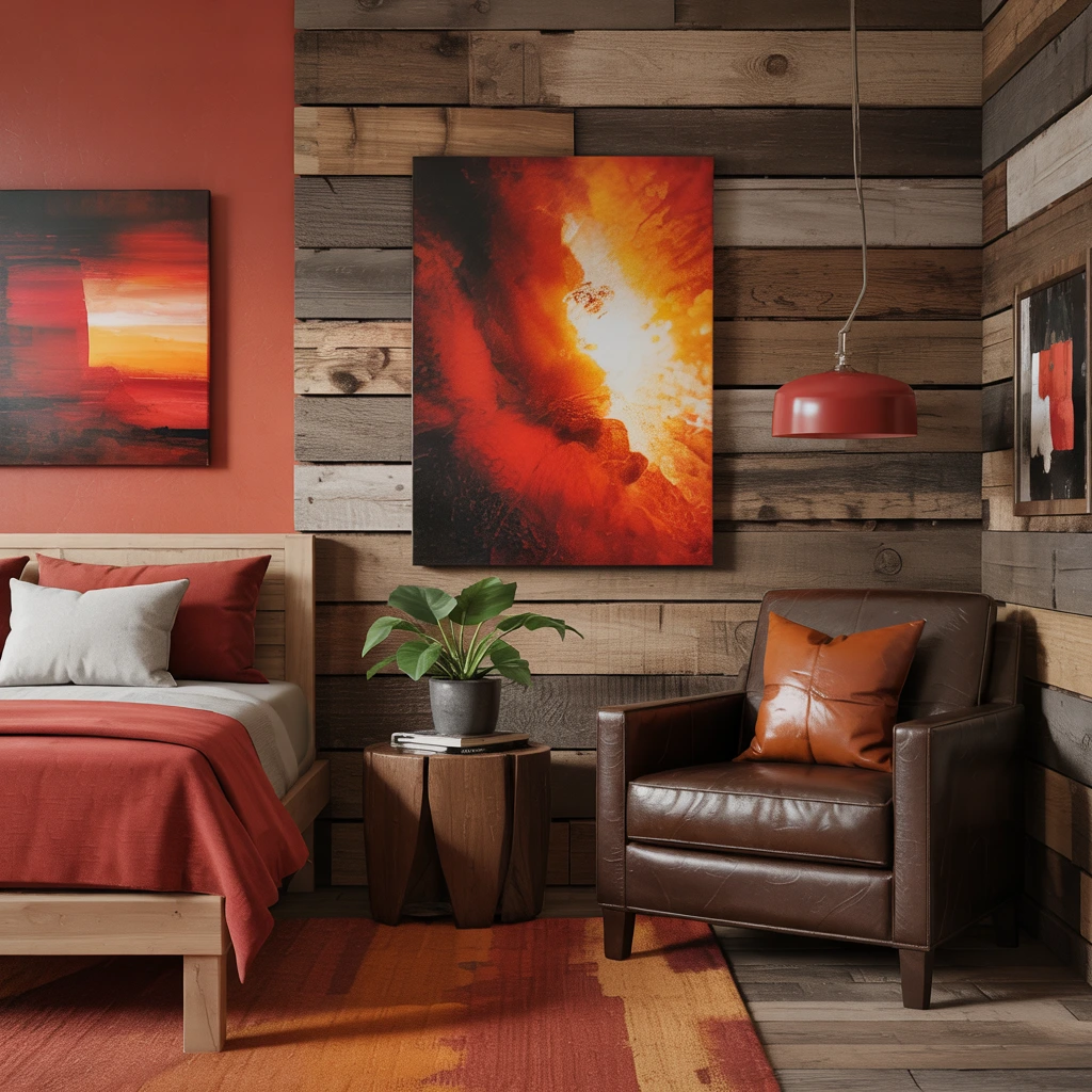 Plank wood walls with red and orange artwork create a modern wooded hideaway feeling. A chocolate brown chair with caramel undertones maintains the cabin-like aesthetic. This earthy palette feels warm and grounding.