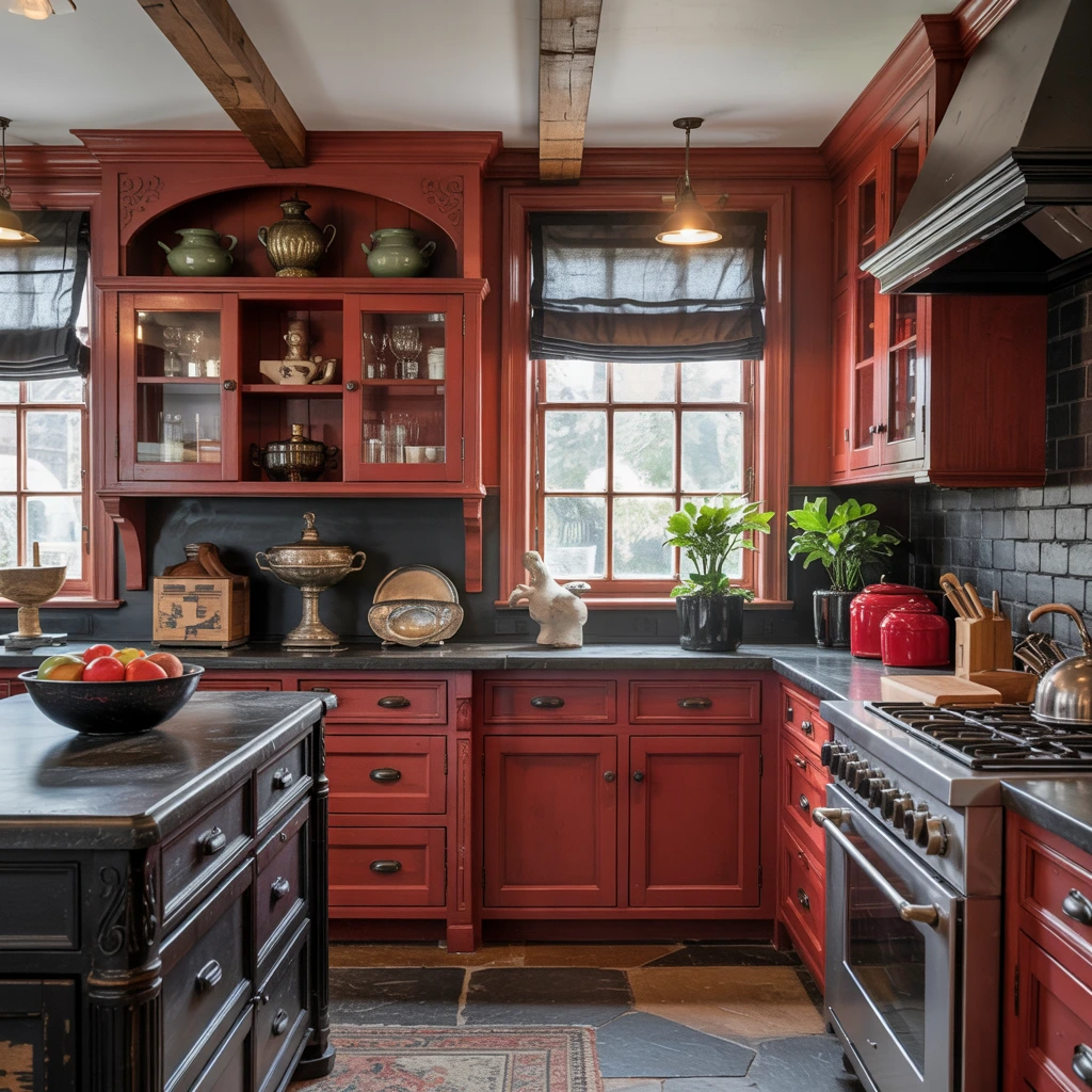 Aged black finishes add upscale, furniture-quality details to red color schemes. I recommend this combination for cottage-style kitchens.