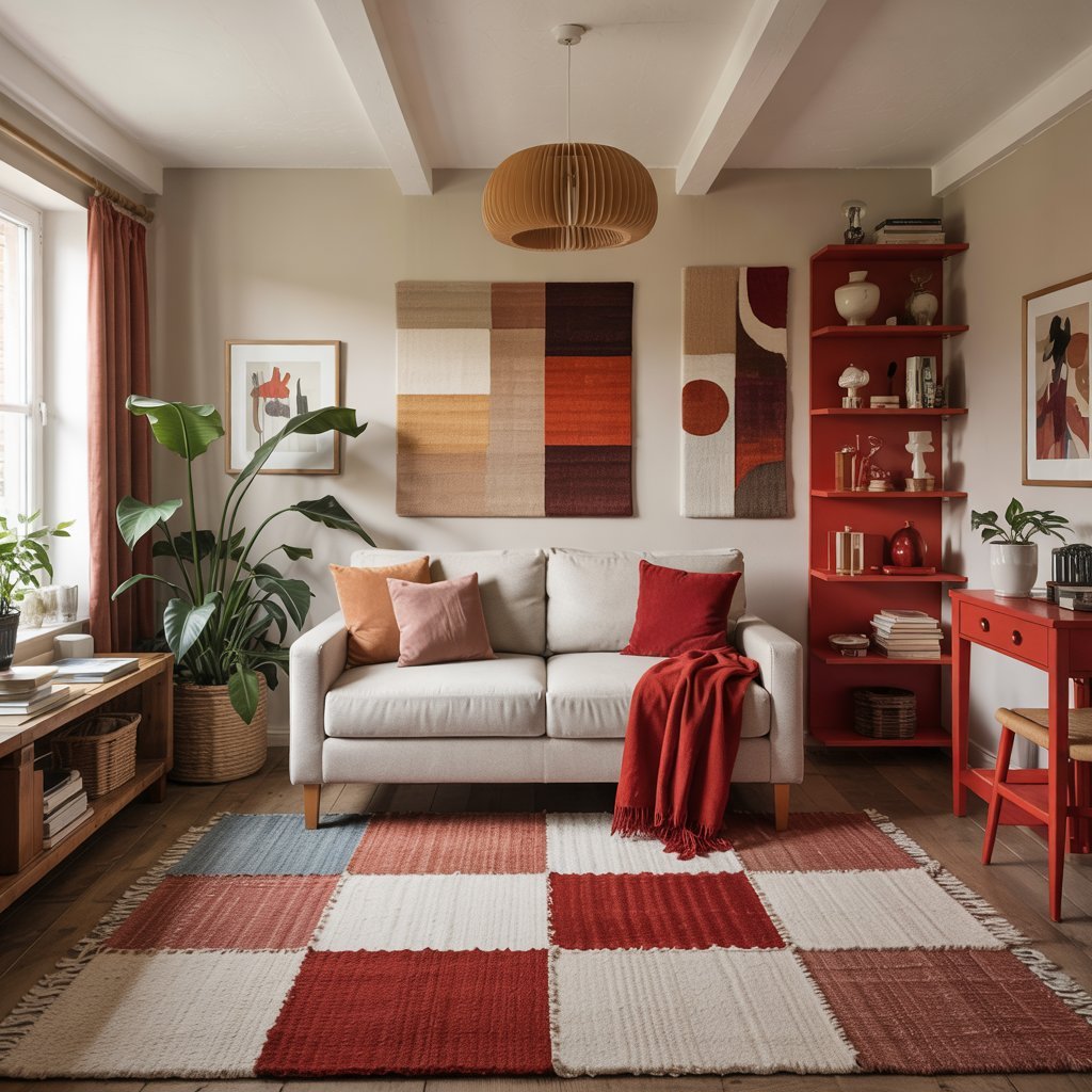 A range of earthy, faded reds in patchwork area rugs ground a space, while brighter red pops in side tables and bookshelves pull the eye around the room. Ecru wall paint, pendant lights, and upholstery all work together because they share warm undertones rather than cool ones.