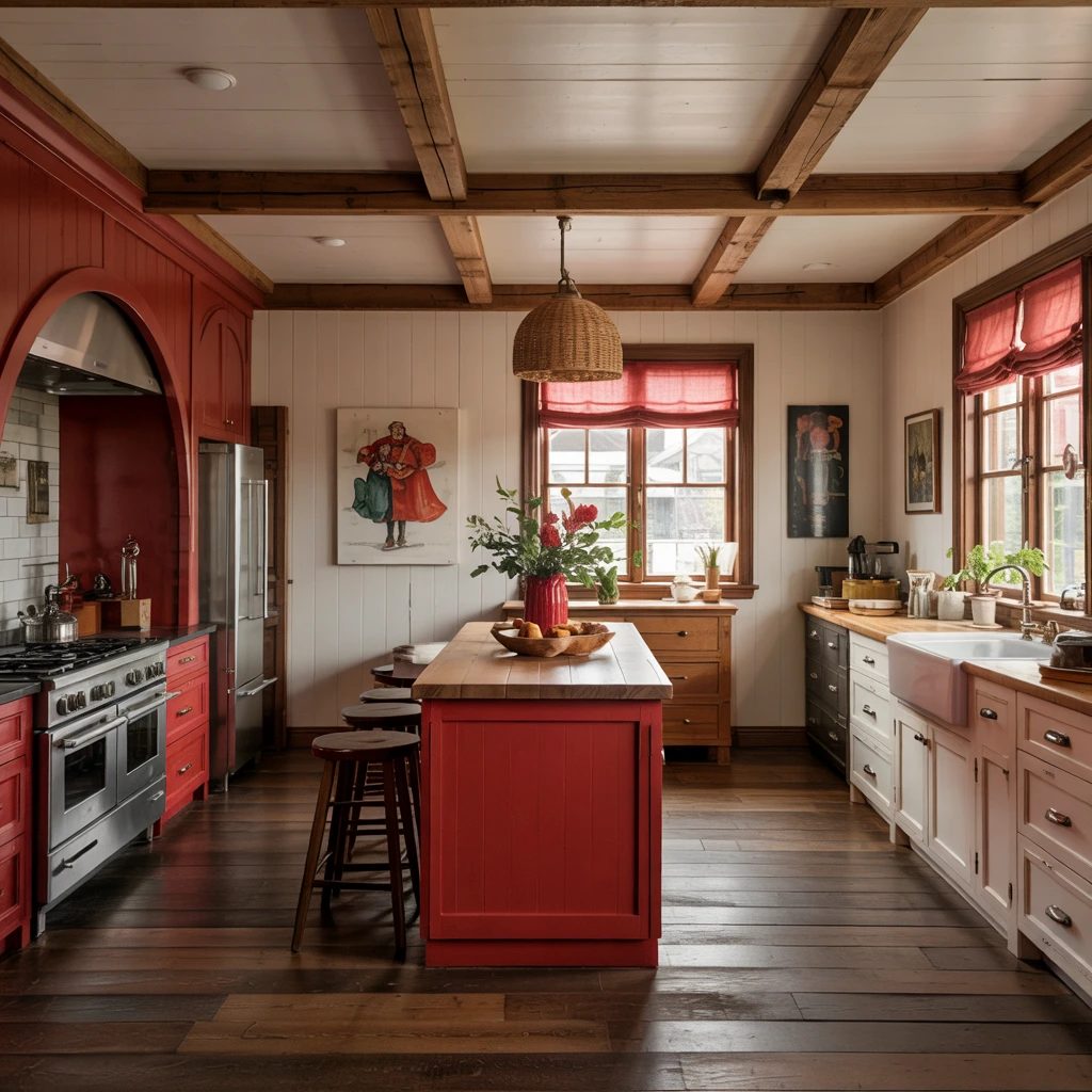 Dark wood floors allow white cabinetry and red kitchen islands to shine without competing. Vintage-style hardware on red pieces enhances the warmth. Wood paneling on walls creates a cabin-like feel when combined with red and orange artwork.