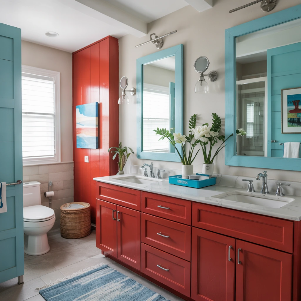 I’ve used bright red cabinetry with turquoise accents in bathrooms to create a contemporary coastal look. Large mirrors with light wood trim help lighten the overall aesthetic. Chrome fixtures tie everything together for a cohesive finish.