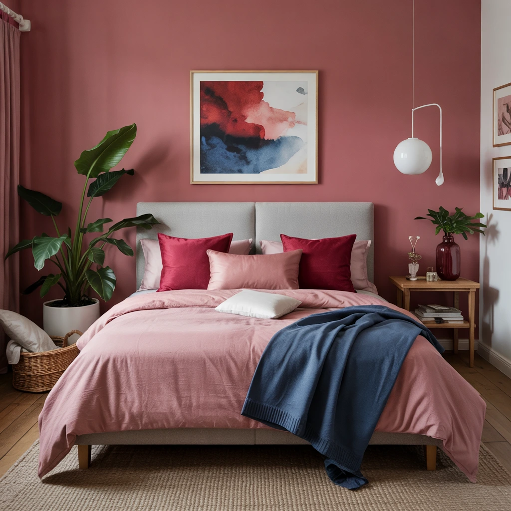 Dusty rose softens red’s intensity in the most beautiful way. I recommend this pairing for bedrooms where you want warmth without overwhelming energy.