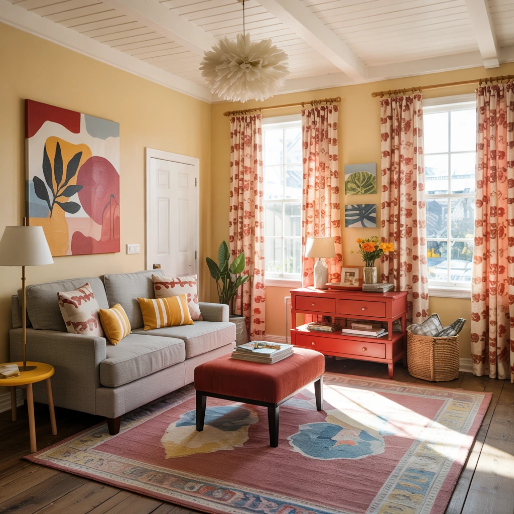 In high-ceiling spaces, I pair red-orange patterns on curtains and area rugs with pale yellow walls. The yellow prevents the red from feeling too heavy, while lavender accents add an extra layer of visual interest. This “more is more” approach works when you balance warm and cool tones carefully.