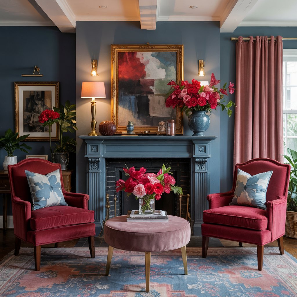 I’ve painted fireplace walls in dark slate blue and added red velvet chairs for a dramatic living room focal point. Pink and red blooms on the mantel repeat the warm hues for balance. The combination feels both modern and timeless.