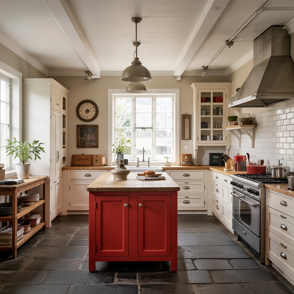 A red kitchen island serves as a bold focal point against creamy white walls and vintage-style hardware. Dark floors recede into the background, keeping all attention on the cabinetry. Two pendant lamps above the island draw the eye exactly where I want it.