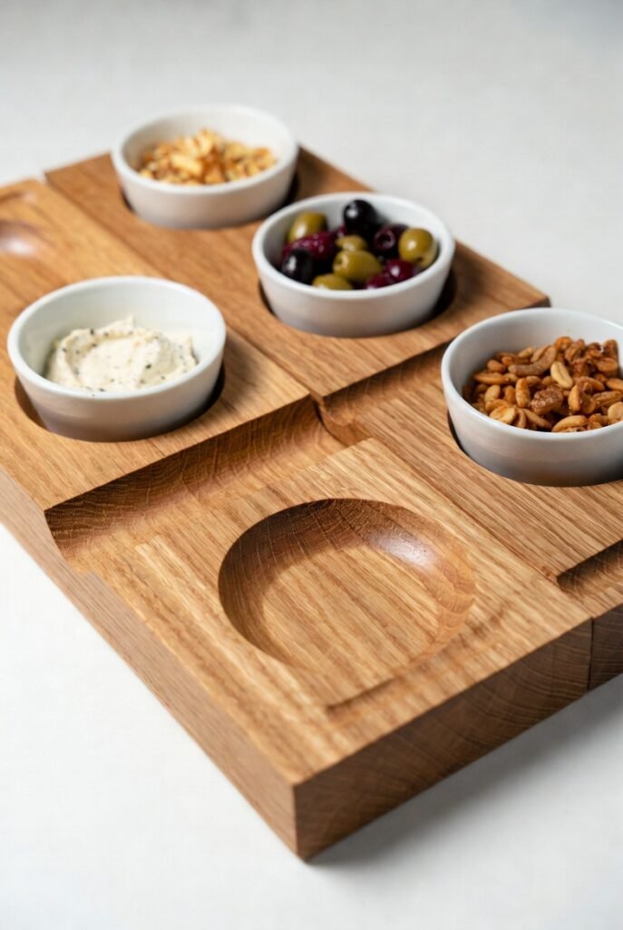 It’s perfect for serving dips, olives, or nuts alongside your charcuterie. This keeps everything organized on one board and makes it easy to carry from the kitchen to your guests. It’s a design that’s both clever and incredibly practical.