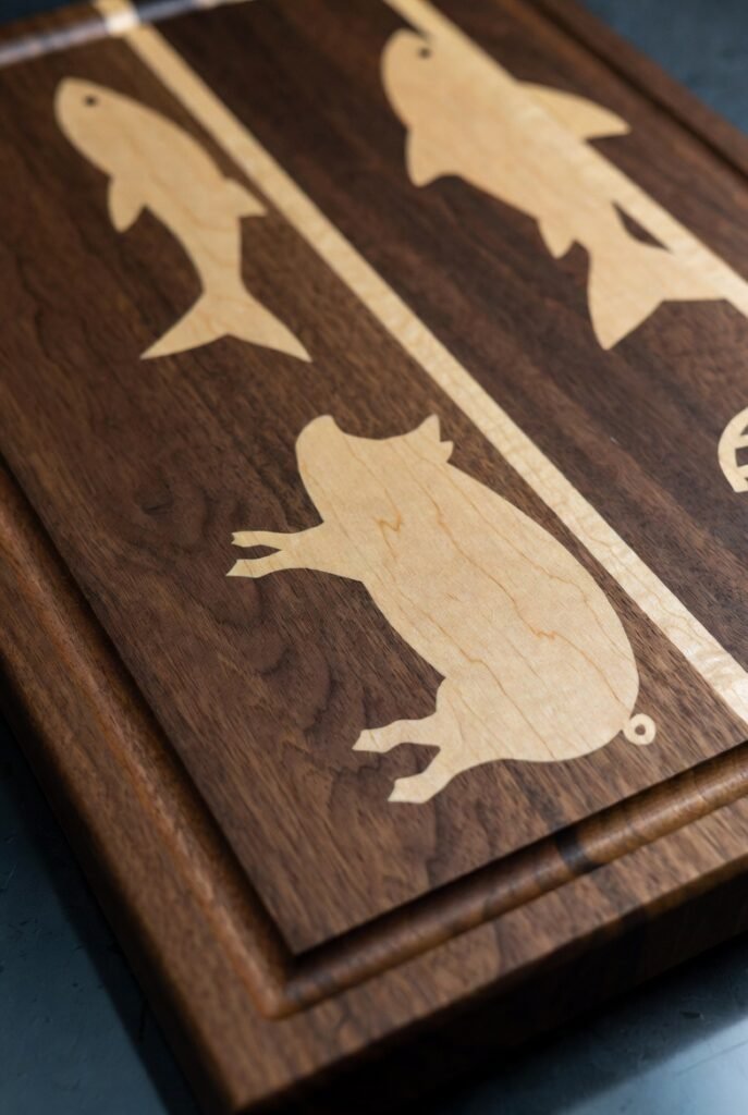 Finally, get creative with themed inlays. Using contrasting wood veneers, I cut out and inlay fun shapes or logos. Think a pig shape for a pork carving board, a fish for a filleting board, or even your favorite sports team’s logo.