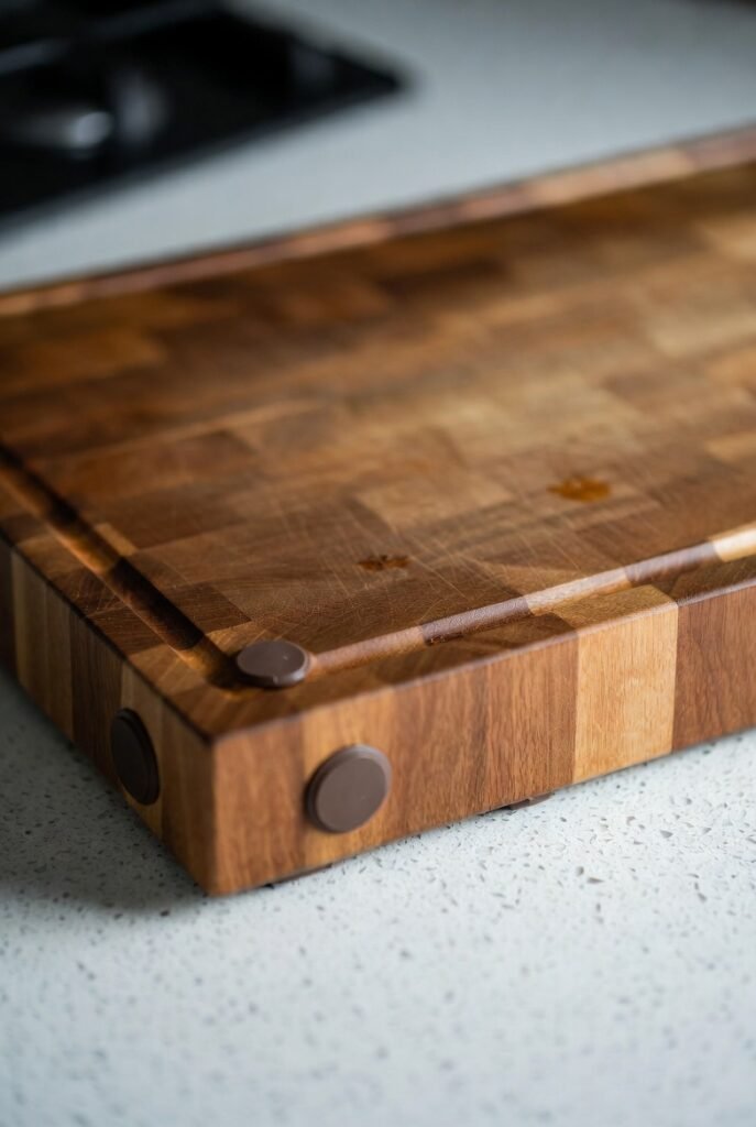 To give a standard cutting block a more substantial, furniture-like feel, I add small feet to the bottom. This elevates the block off the counter, making it look more like a permanent fixture and allowing air to circulate underneath, which helps prevent warping.