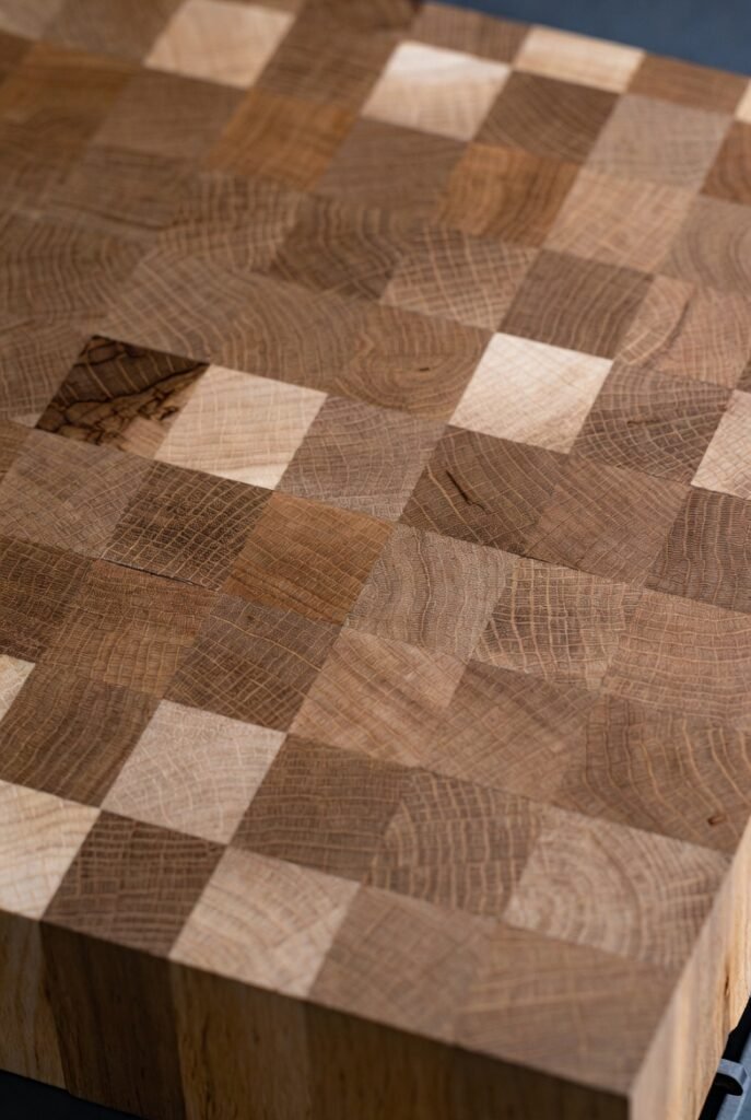 The first idea I want to share is the classic end-grain cutting block. Instead of laying the wood flat, you orient the wood pieces vertically, so the “end grain” faces up. This creates a checkerboard pattern that’s not only beautiful but also incredibly durable.