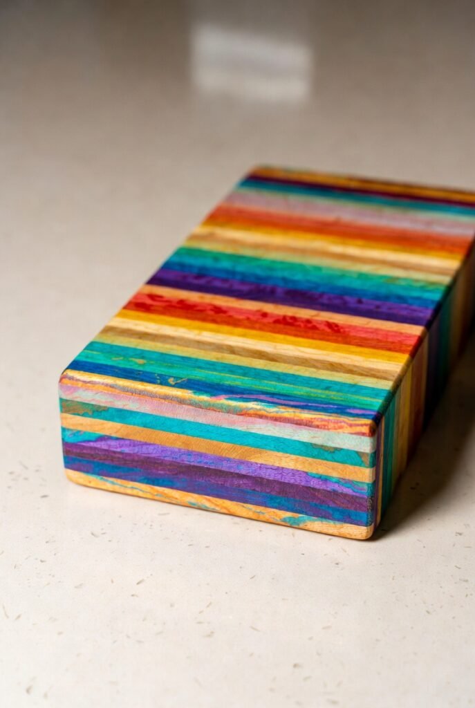 Here’s a really cool and eco-friendly idea I stumbled upon: a cutting block made from old skateboards. The layers of colored maple wood used in skate decks create vibrant, psychedelic patterns when glued together and shaped.