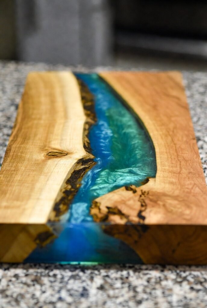 The combination of natural wood and glossy, vibrant epoxy is breathtaking. You can use any color you like, from deep blues to shimmering greens, to match your kitchen decor. It’s a project that requires a bit of patience, but the final product is a functional work of art.