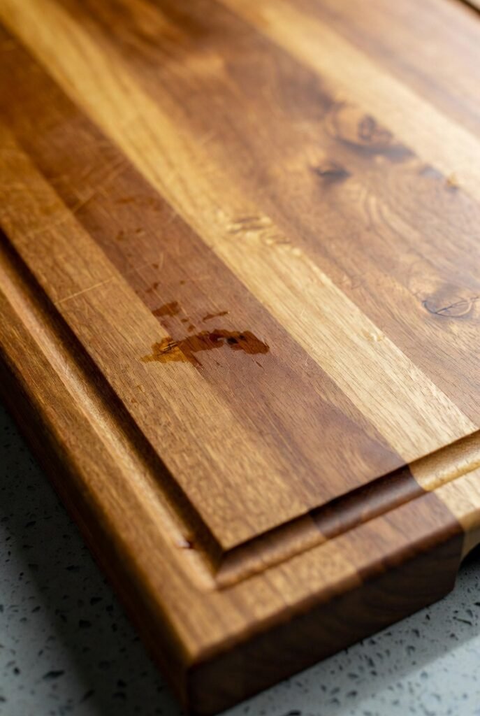 The groove catches all the liquids, preventing them from spilling onto your countertop and making a mess. It’s a practical feature that I now add to most of the larger cutting blocks I make. It makes cleanup so much easier.