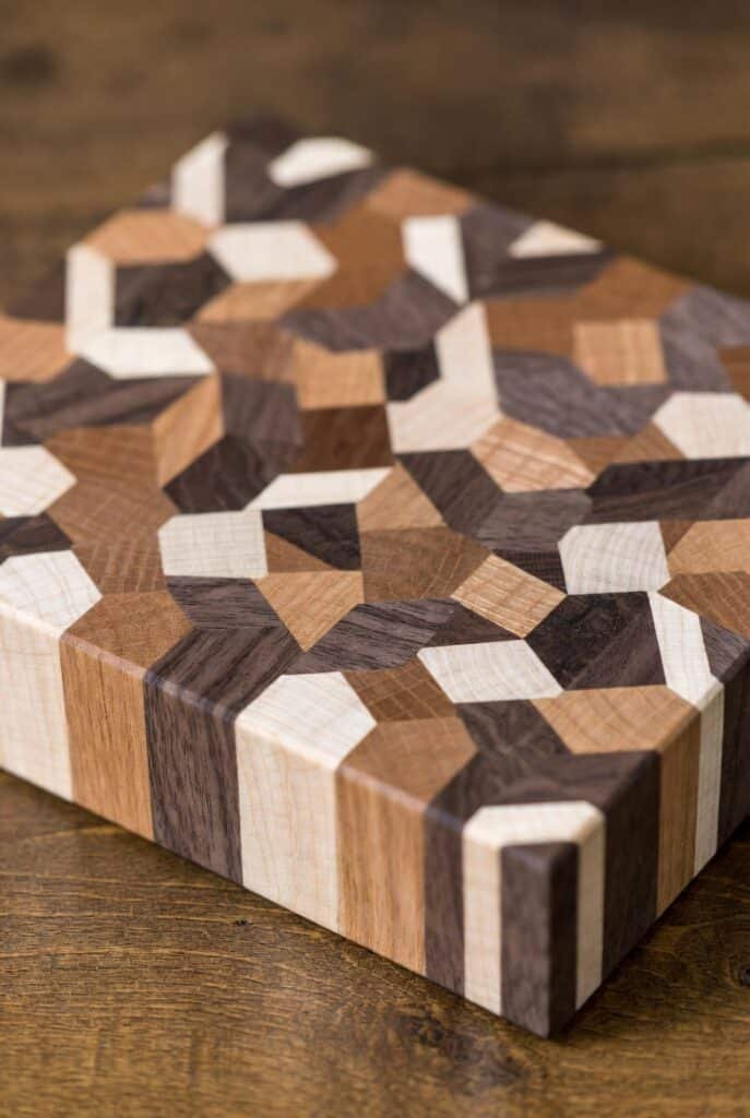 The process is like creating a mosaic with wood. The patterns can be as simple or as complex as you want. The end result is a stunning, modern cutting block that showcases your craftsmanship.