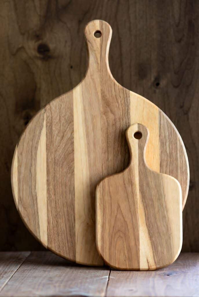 I like to add a handle or a hole for hanging to make it easy to store and display. A large, round maple block is perfect for rolling out dough, while a smaller acacia one is great for a chic cheese platter.