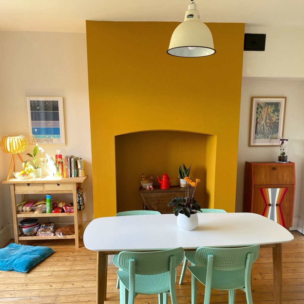 This dining room paint color idea works beautifully in spaces with good natural light, as the golden tones reflect warmth throughout the day. Mid-century modern furniture and quirky accessories complement the retro-inspired color choice.