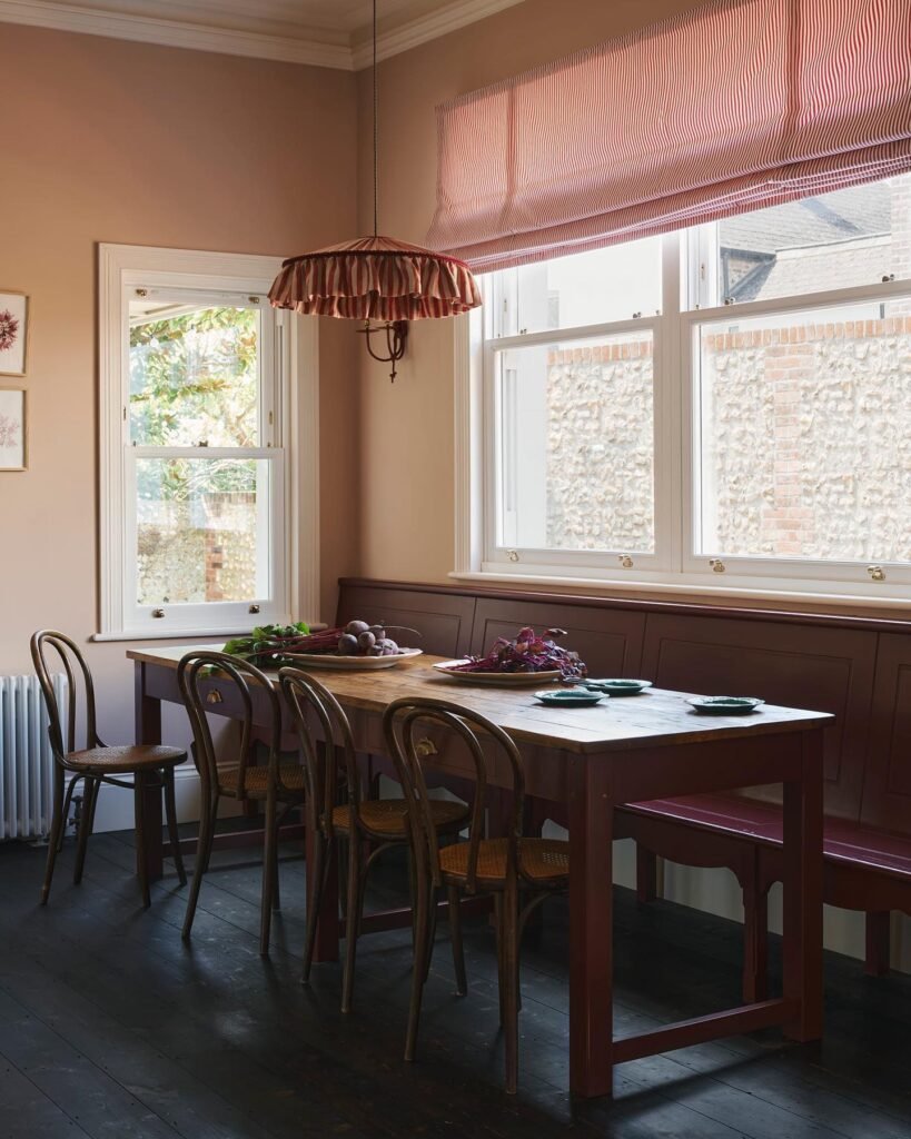 Muted rose-colored walls bring unexpected charm to this contemporary dining space.