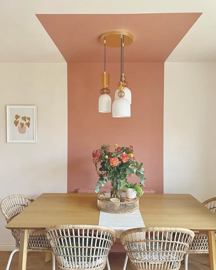 This creative approach to dining room paint color ideas turns conventional wisdom upside down by painting the ceiling instead of the walls.