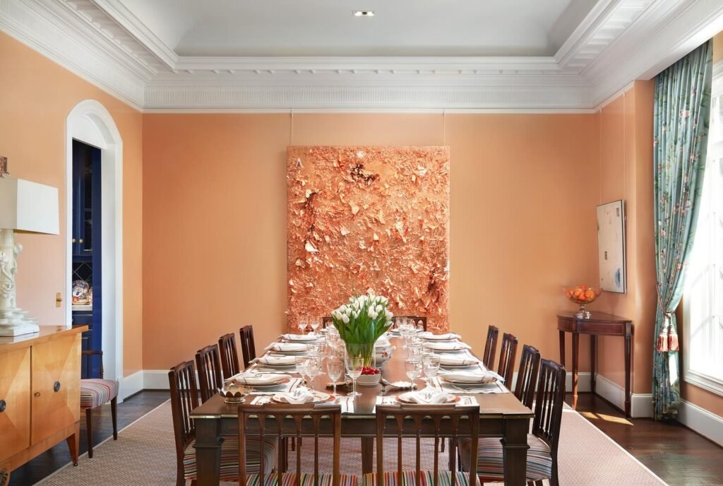 Soft peach walls bring warmth and sophistication to this grand dining room. This dining room paint color creates a welcoming atmosphere that flatters both guests and food presentation beautifully.