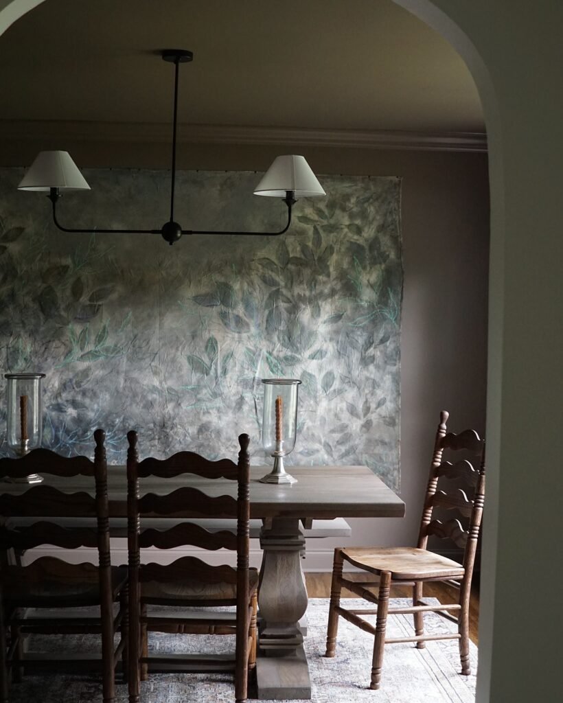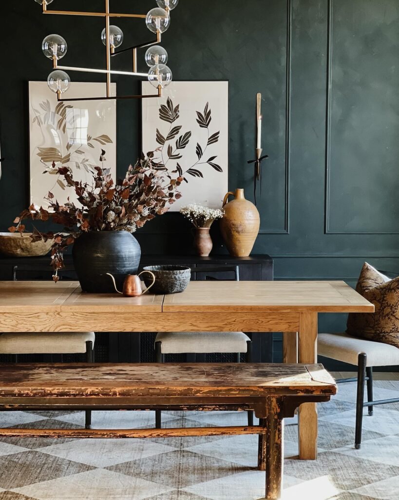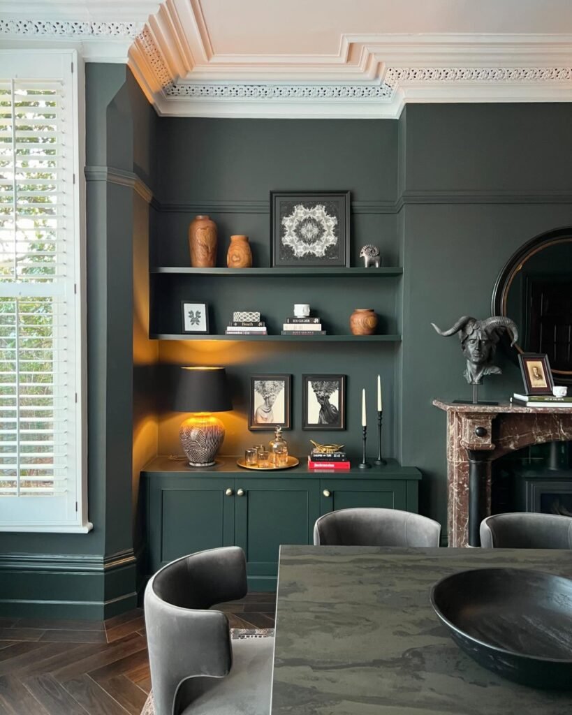 This dining room proves that dark paint colors can feel fresh and contemporary when paired with the right lighting and accessories. The result is a space that feels both grounding and energizing.