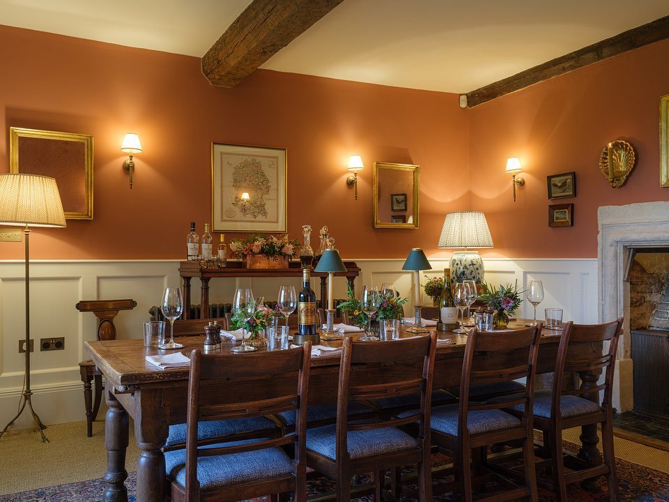 The orange-toned walls make this space feel incredibly welcoming for family gatherings and dinner parties alike. Traditional furnishings and brass accents enhance the cozy, collected-over-time aesthetic.