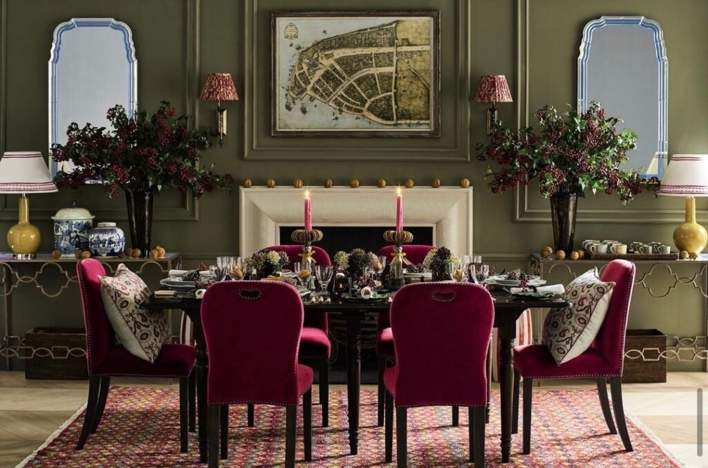 Rich olive green walls establish an atmosphere of refined elegance in this formal dining space. This dining room paint color choice creates depth and sophistication while remaining surprisingly versatile for both intimate dinners and grand entertaining. The muted green backdrop allows burgundy velvet chairs and brass accents to shine dramatically.